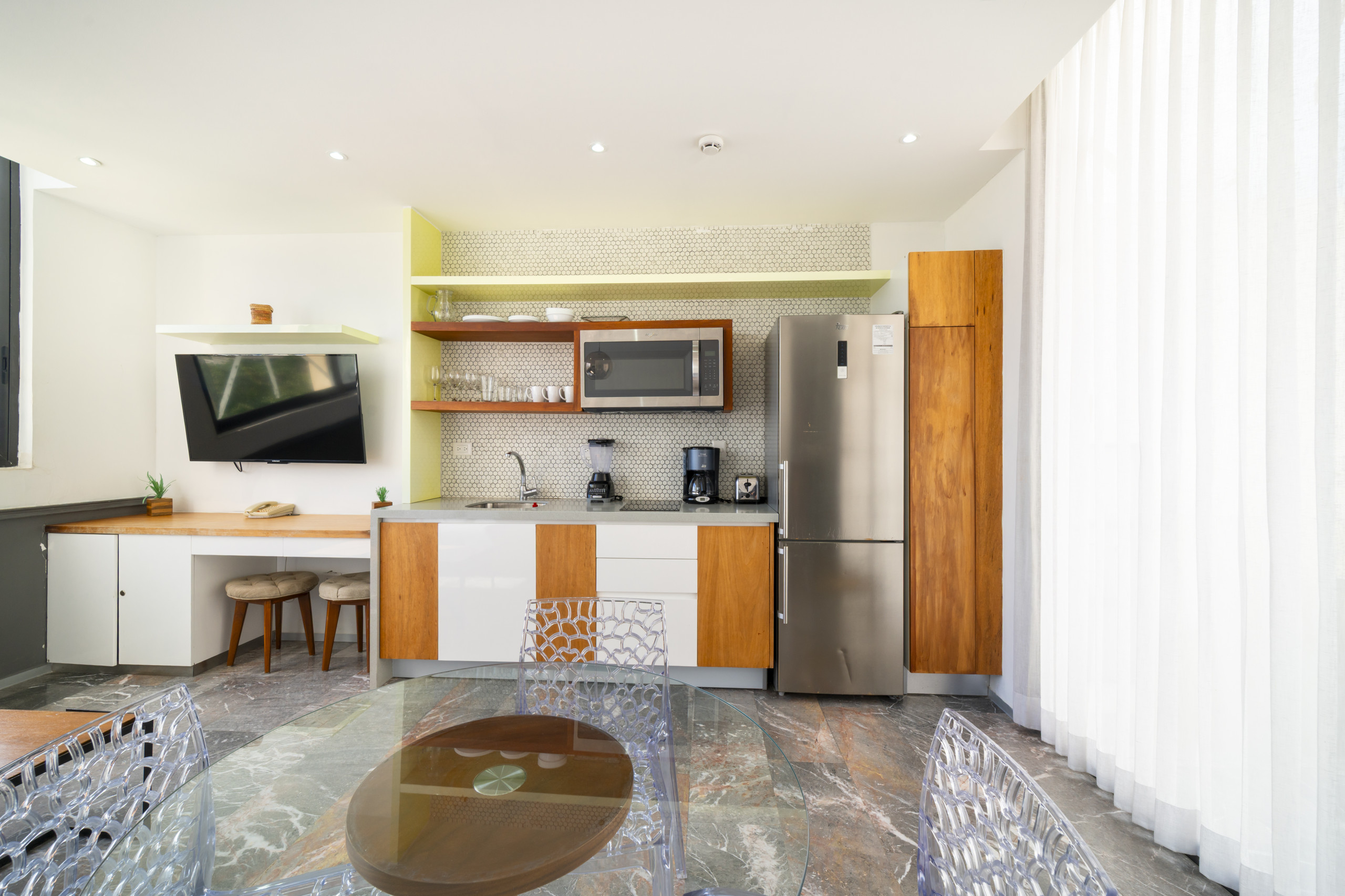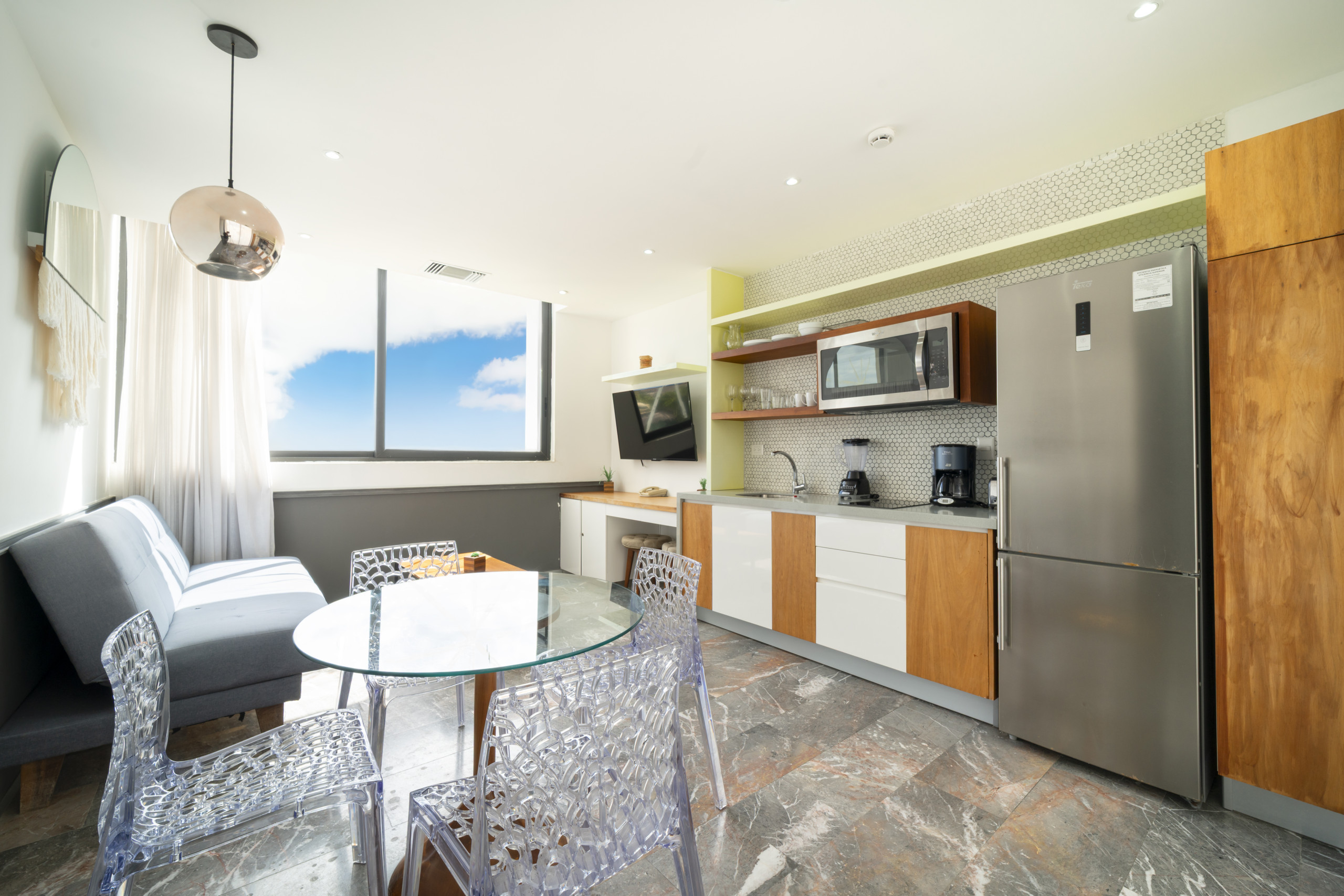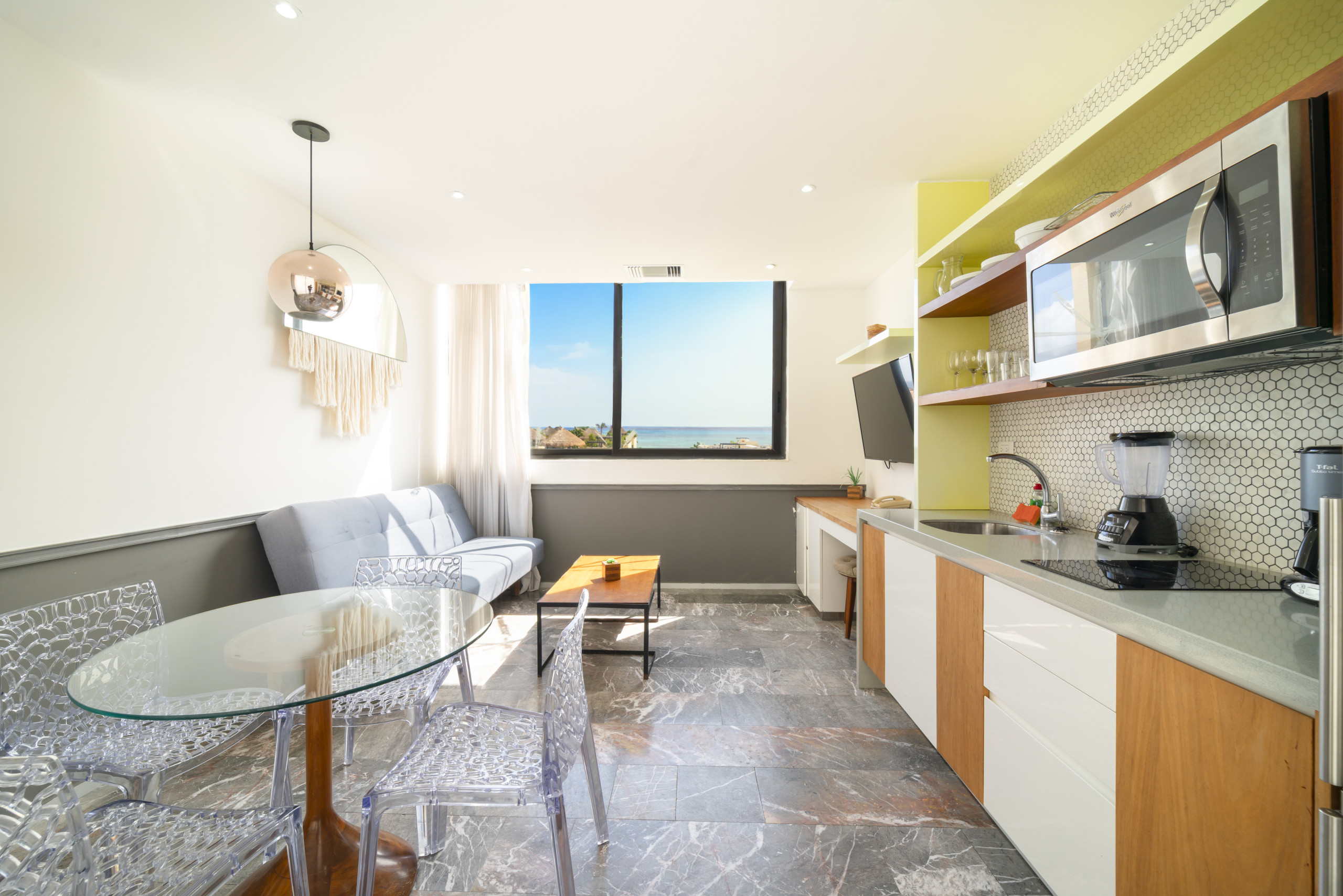 El departamento en Playa del Carmen posee 2 habitaciones y capacidad para 4 personas. Alojamiento de 92 m². Dispone de elevador, terraza, caja fuerte, acceso internet (wifi), aire acondicionado, alberca comunitaria, Televisión. La cocina americana, de inducción, está equipada con refrigerador, microondas, utensilios/cocina, cafetera y tostador.