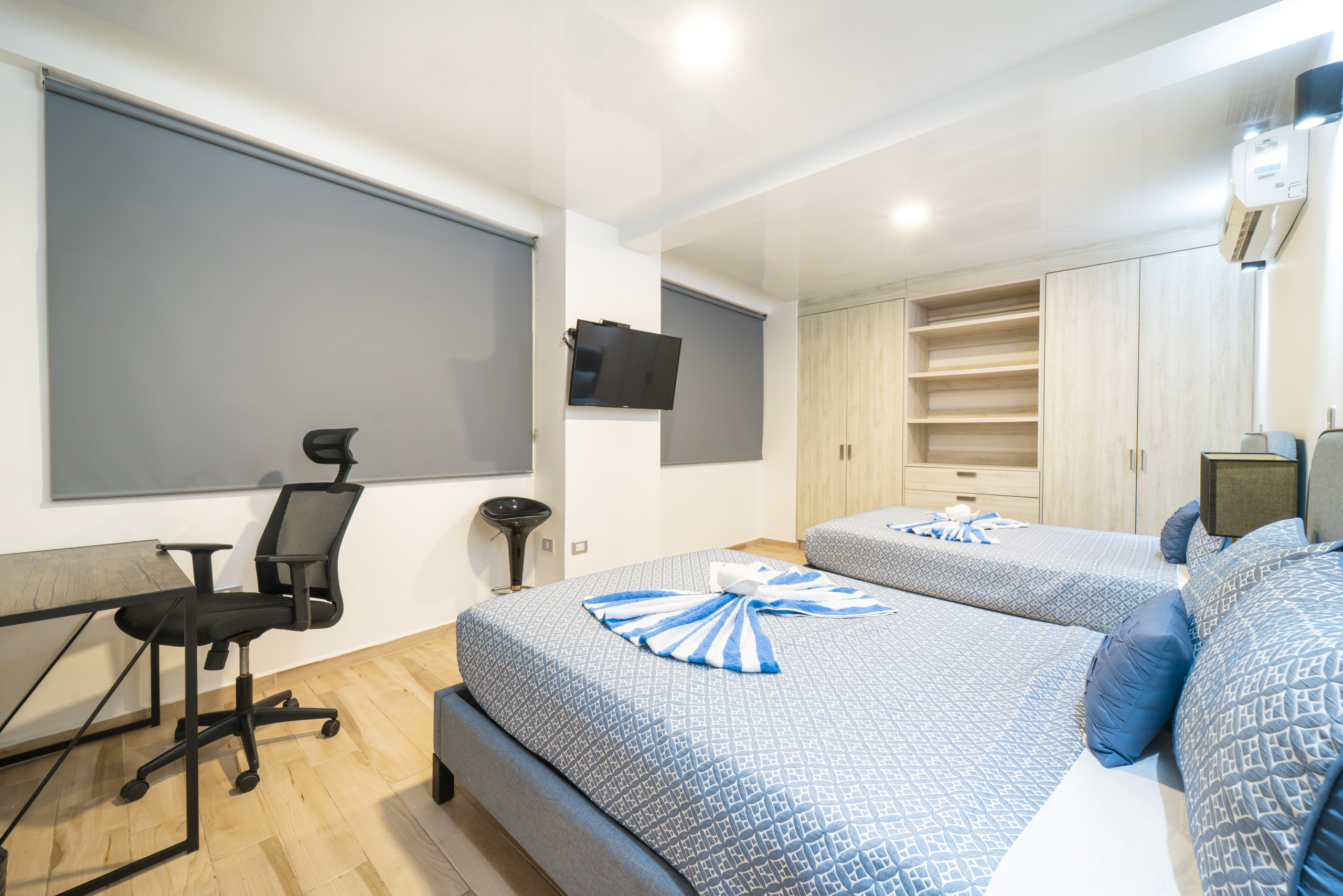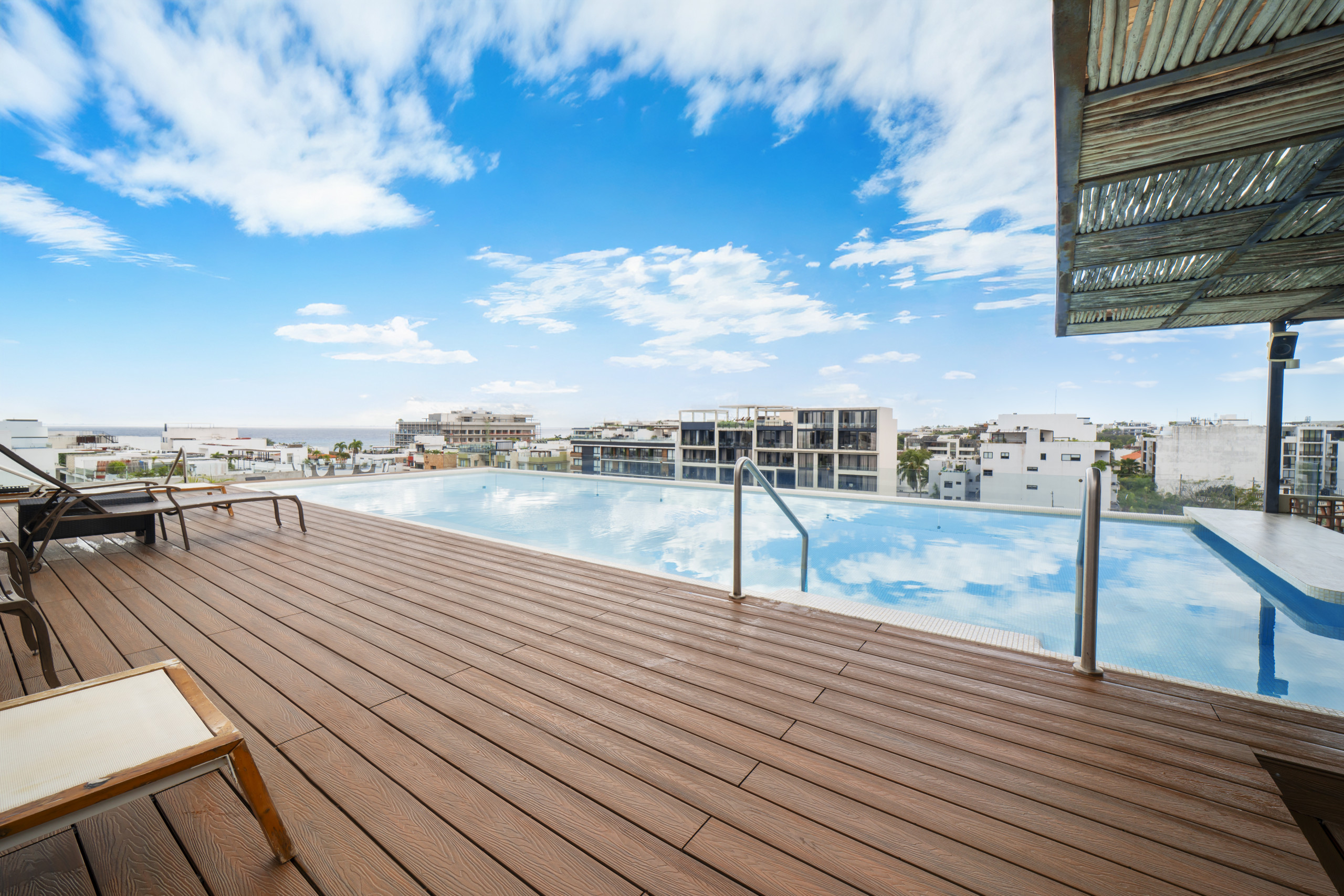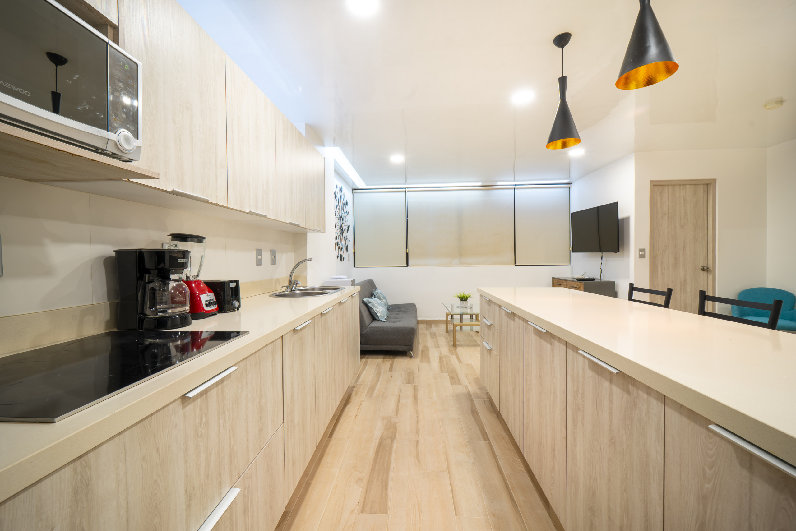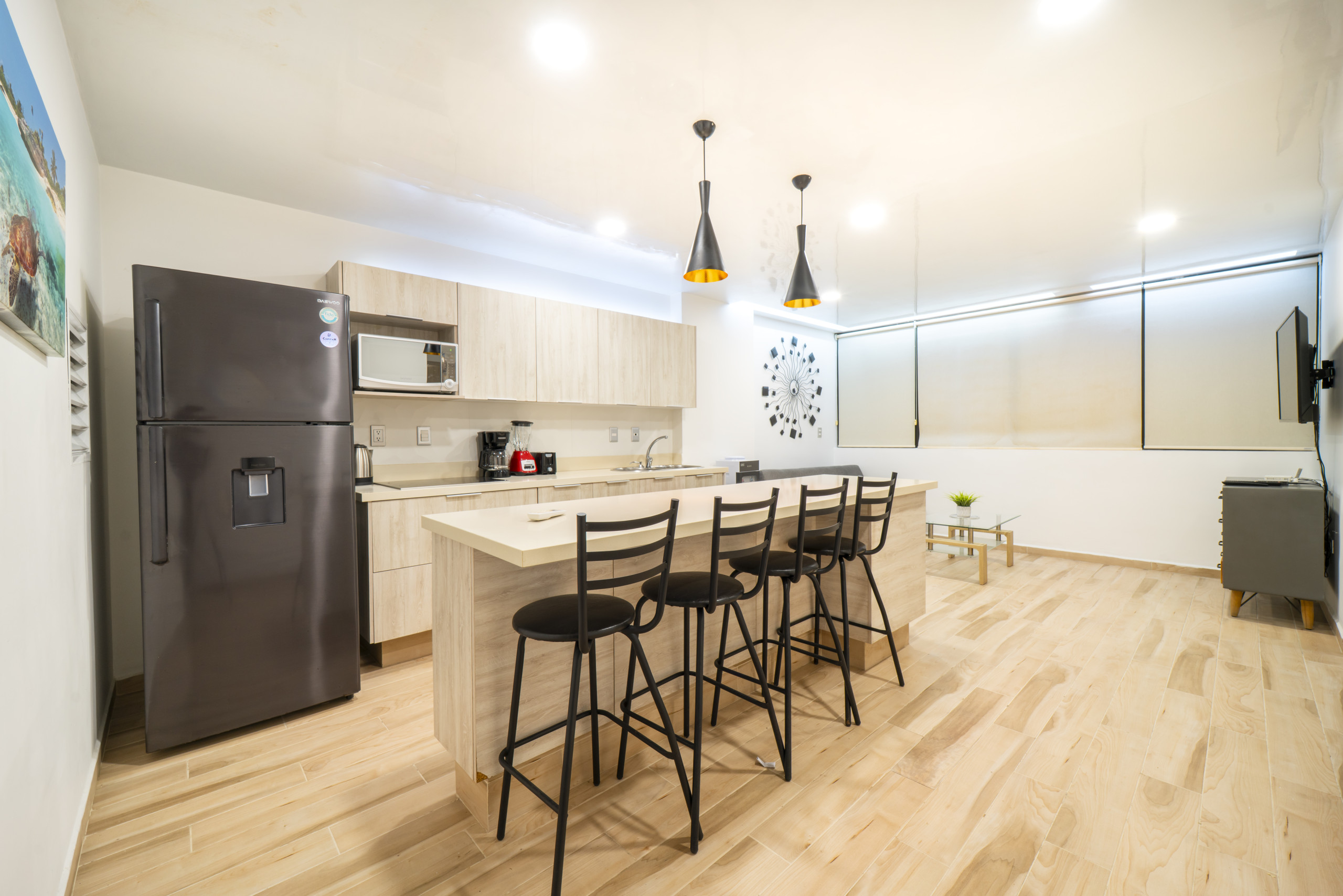 El departamento en Playa del Carmen posee 2 habitaciones y capacidad para 4 personas. Alojamiento de 99 m². Dispone de elevador, terraza, lavadora, caja fuerte, acceso internet (wifi), gimnasio, aire acondicionado, alberca comunitaria, garage en mismo edificio, 2 Televisiones. La cocina americana, de inducción, está equipada con refrigerador, microondas, cafetera y tostador.