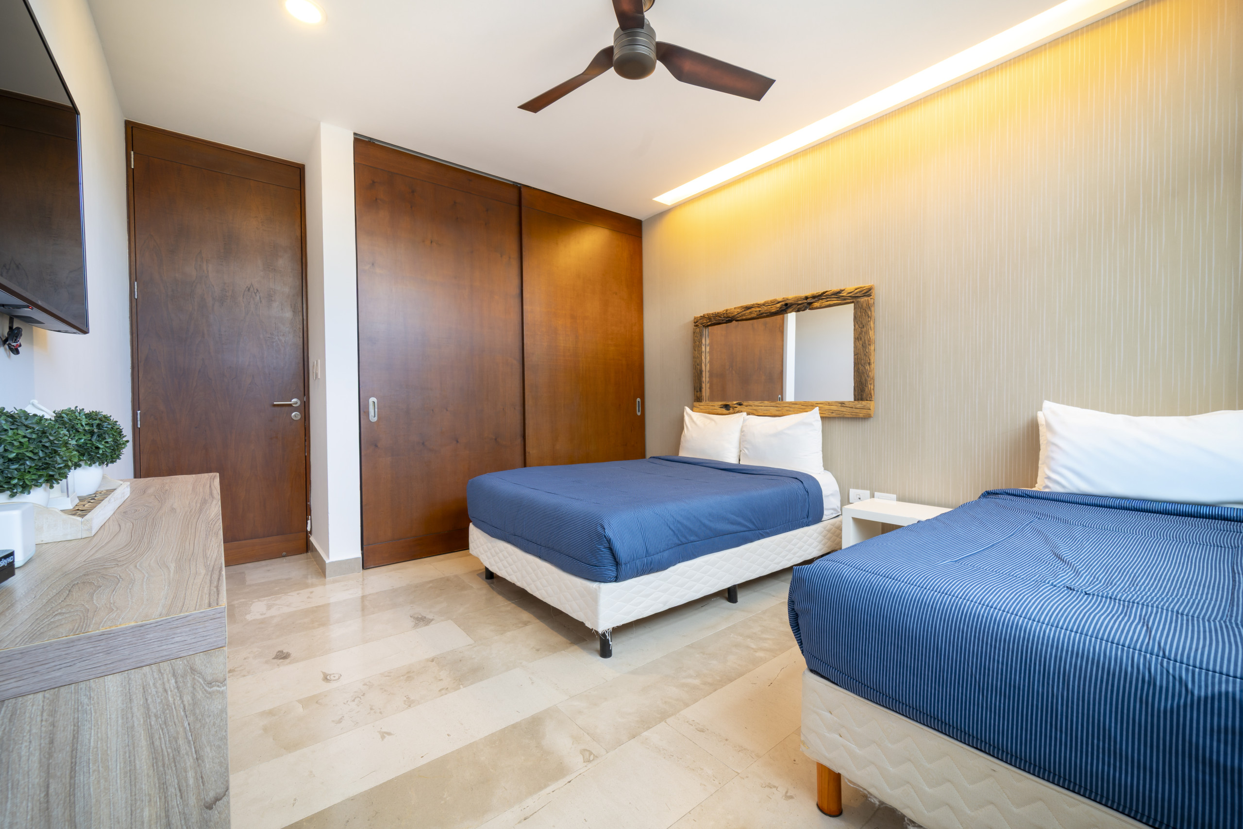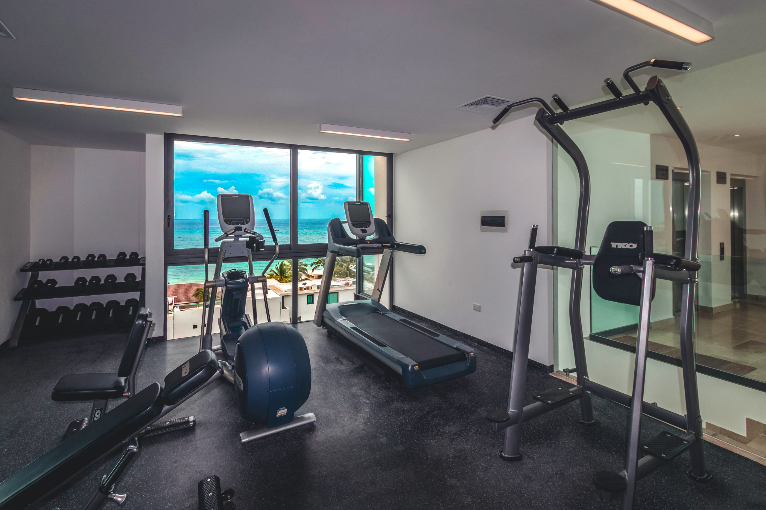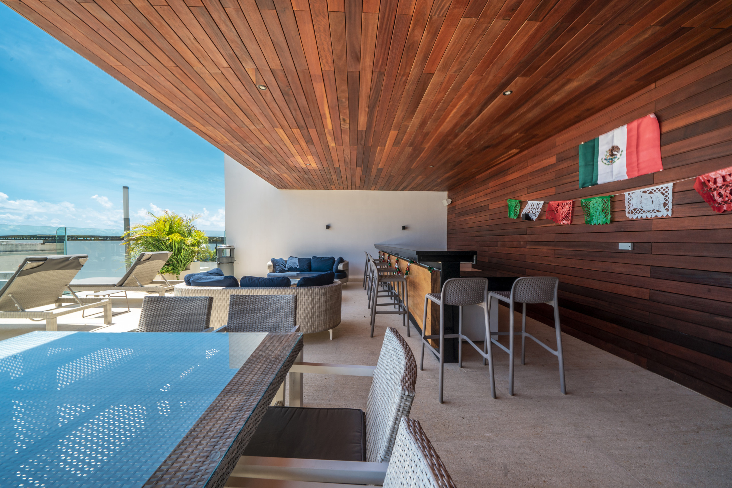 El departamento en Playa del Carmen posee 2 habitaciones y capacidad para 5 personas. Alojamiento de 108 m². Dispone de elevador, terraza, lavadora, caja fuerte, acceso internet (wifi), balcón, gimnasio, alberca comunitaria, garage en mismo edificio, 1 Televisión.La cocina americana, de inducción, está equipada con refrigerador, microondas, utensilios/cocina, cafetera y tostador.